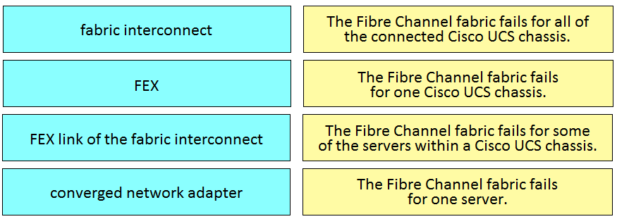 Drag and drop the components from the left onto the descriptions on the right that indicate what occurs to Fibre Channel fabric when that component fails.