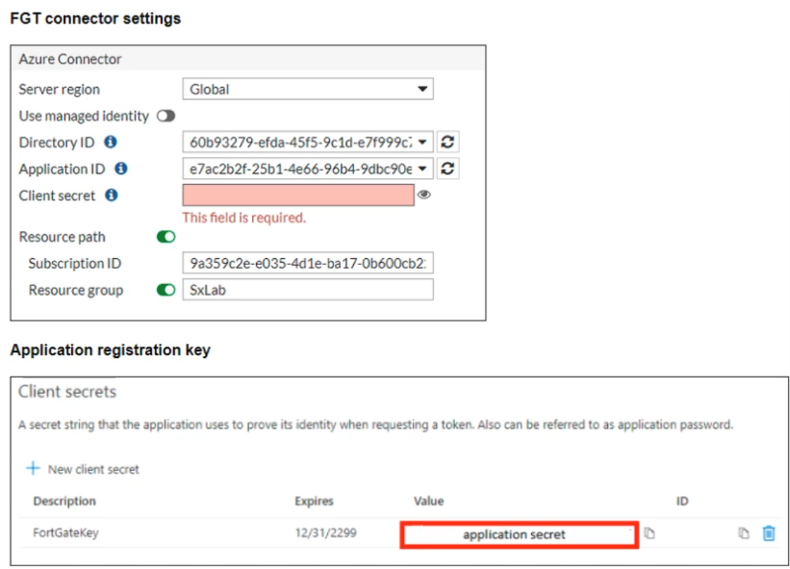 You are configuring an SDN connector for Azure on a FortiGate device You completed all the required steps on the Azure side. While configuring the FortiGate side, you notice that you did not save the client secret used in the Azure App Registration.