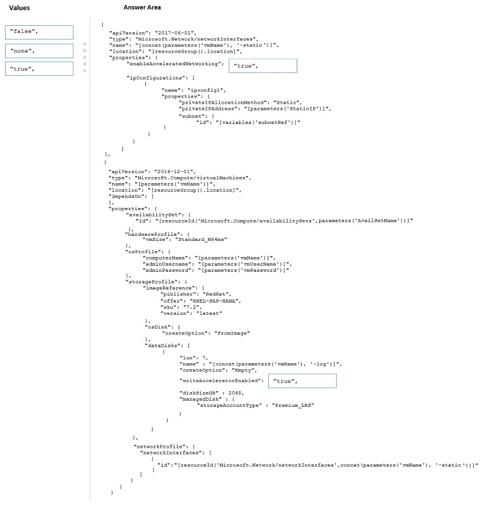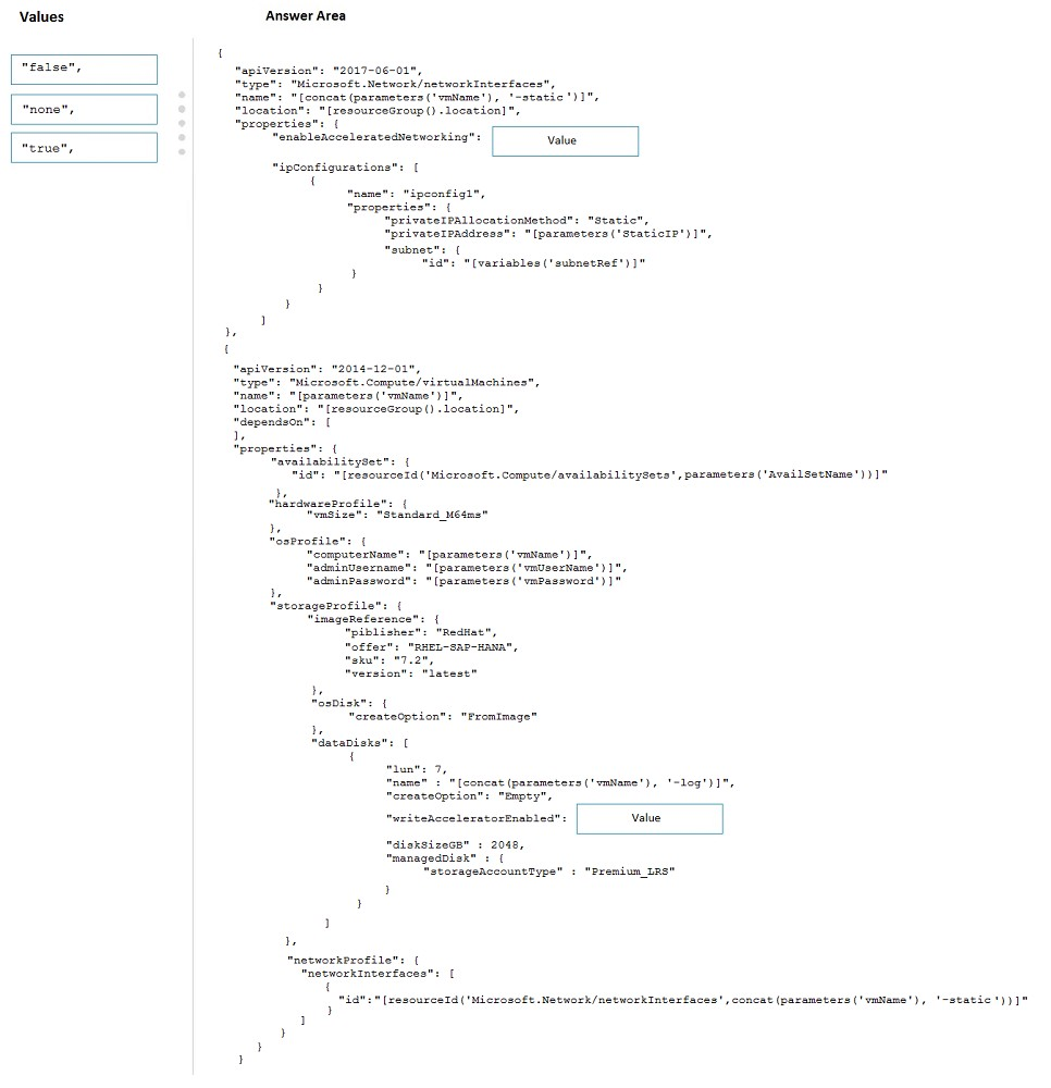 How should you configure Accelerated Networking and Write Accelerator in the template? To answer, drag the appropriate values to the correct targets. Each value may be used once, more than once, or not at all. You may need to drag the split bar between panes or scroll to view content.