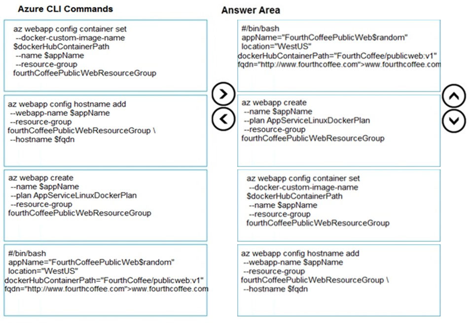 Which order should the CLI commands be used to develop the solution? To answer, move all of the Azure CLI commands from the list of commands to the answer area and arrange them in the correct order.