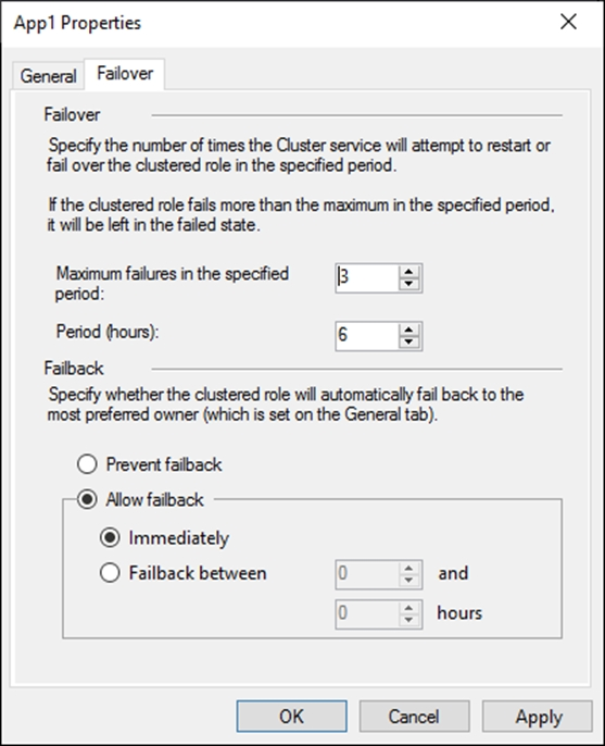 A third potential setting is used after a resource's cluster node comes back online after a failover. Under the Failover tab is the Failback setting with the default setting "prevent failback." When failback is configured, the virtual machine will return back to its original host when that host is again available. If you want virtual machines to return to your known configuration after a host problem, this can be a good thing.