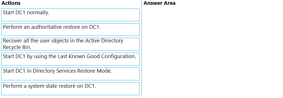Which four actions should you perform in sequence from a domain controller? To answer, move the appropriate actions from the list of actions to the answer area and arrange them in the correct order.