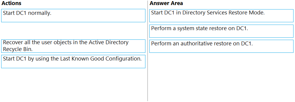 Your network contains an Active Directory Domain Services (AD DS) domain that has the Active Directory Recycle Bin enabled. The domain contains two domain controllers named DC1 and DC2. The system state of the domain controllers is backed up daily at 23:00 by using Windows Server Backup.