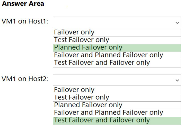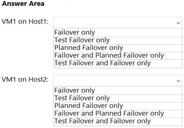 Which types of failovers can you perform on VM1 on each host? To answer, select the appropriate options in the answer area.