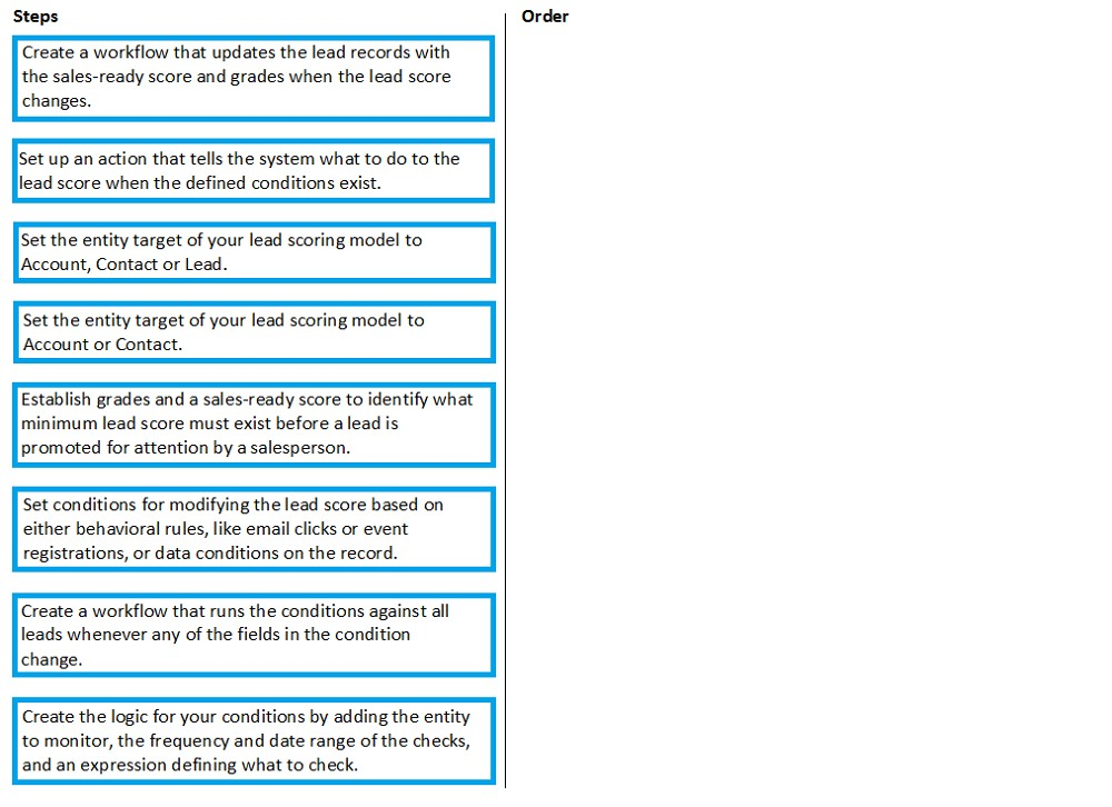 Which five steps in sequence are required to design and set up your lead scoring model in Dynamics 365? (Choose five.) To answer, move the appropriate actions to the answer area and arrange them in the correct order.