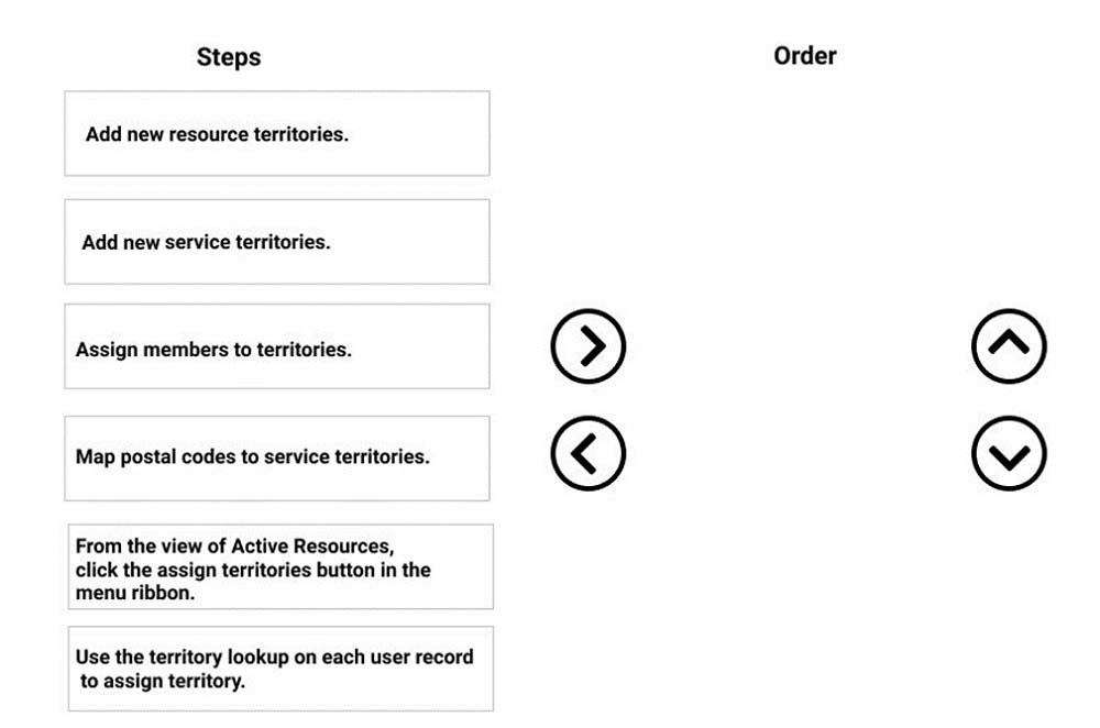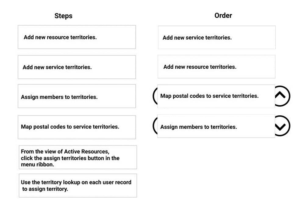 Which four steps, in sequence, must be configured to ensure that when work orders are created they will automatically be mapped to the correct territory? To answer, move the appropriate actions from the list of actions to the answer area and arrange them in the correct order.