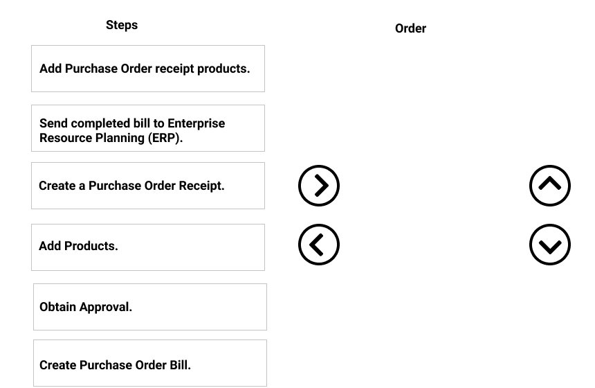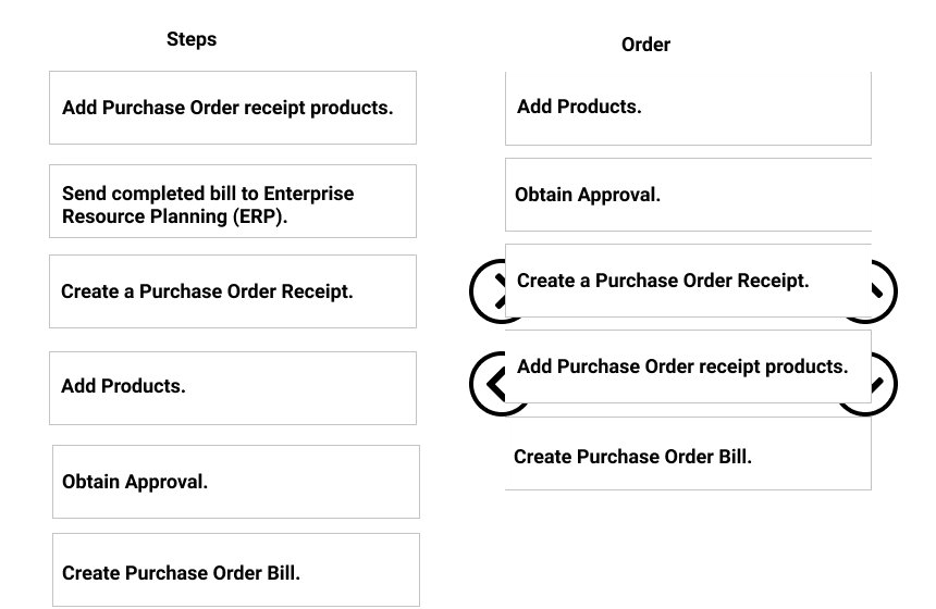 After creating a purchase order, what are the five steps, in sequence, for completing the order and receiving the products? To answer, move the appropriate actions from the list of actions to the answer area and arrange them in the correct order.