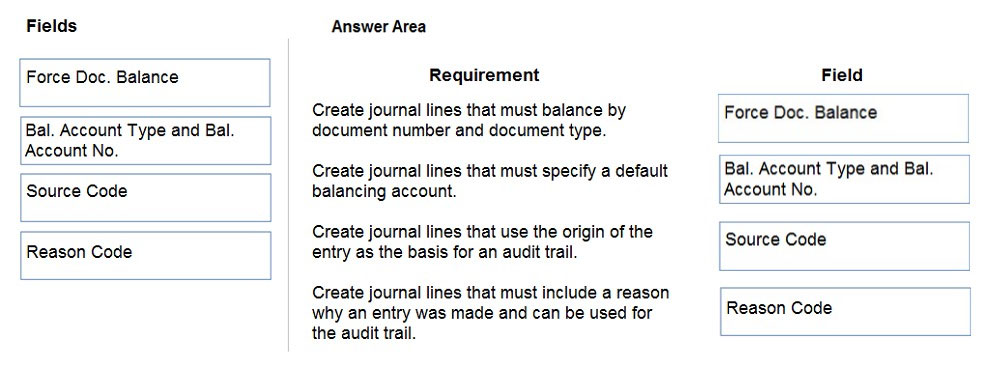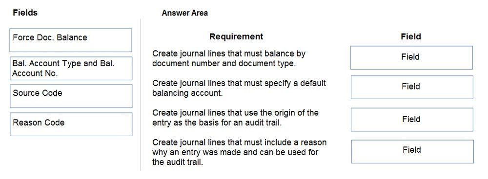 What should you do? To answer, drag the appropriate fields to the correct requirements. Each field may be used once, more than once, or not at all. You may need to drag the split bar between panes or scroll to view content.