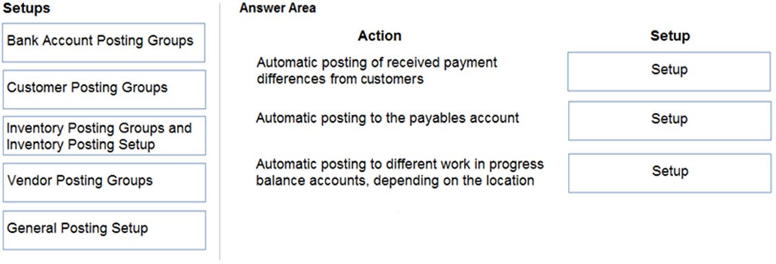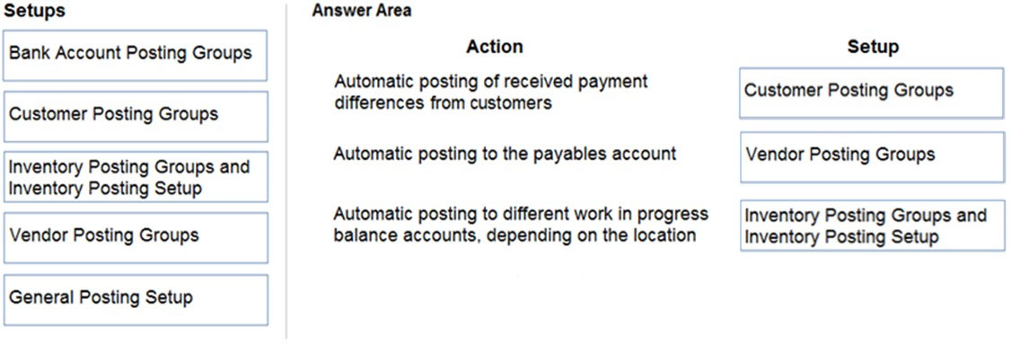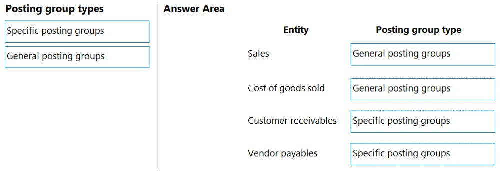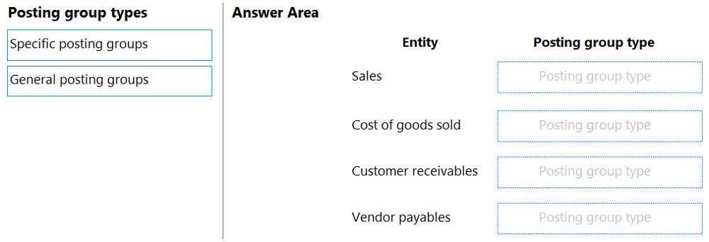 Which type of posting groups should you create? To answer, drag the appropriate posting group types to the correct entities. Each posting group type may be used once, more than once, or not at all. You may need to drag the split bar between panes or scroll to view content.