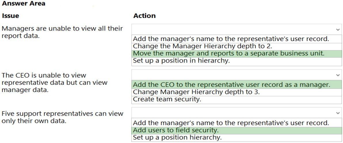 You set up Manager Hierarchy so managers are able to view data only for the representatives who report to them. The CEO must be able to view all data for everyone. All support representatives must be able to view customer information in each other's data across all managers.