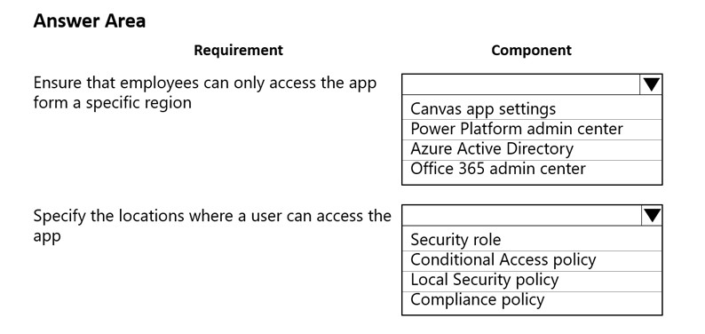 A company uses a canvas app to manage production resources in a specific region. Employees must be at company locations to use the app.