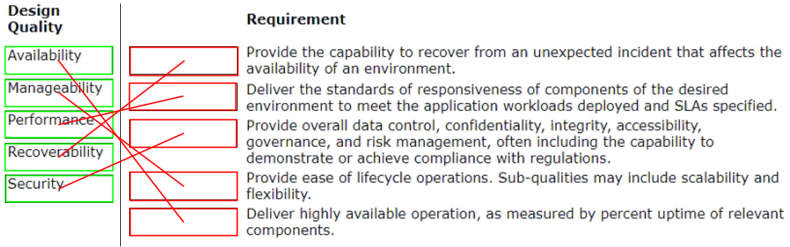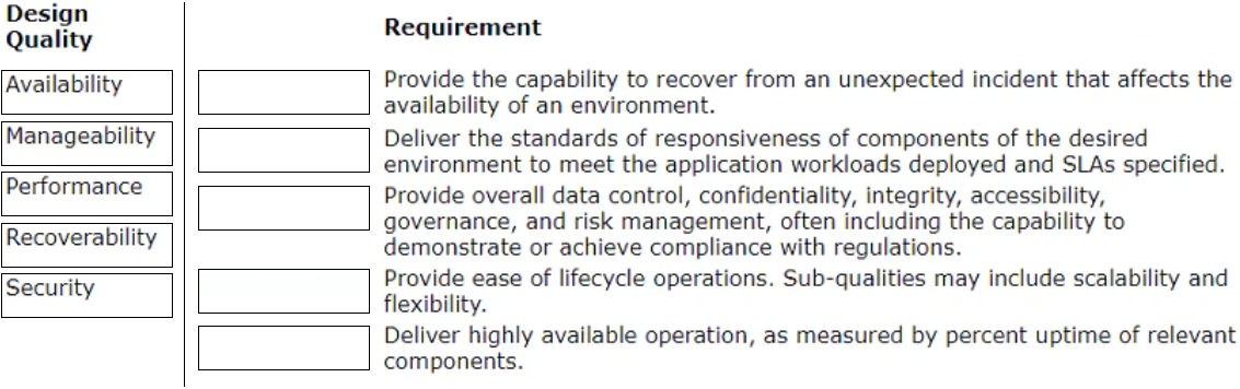 Drag and drop each Design Quality from the left into the box corresponding to the correct requirement on the right.